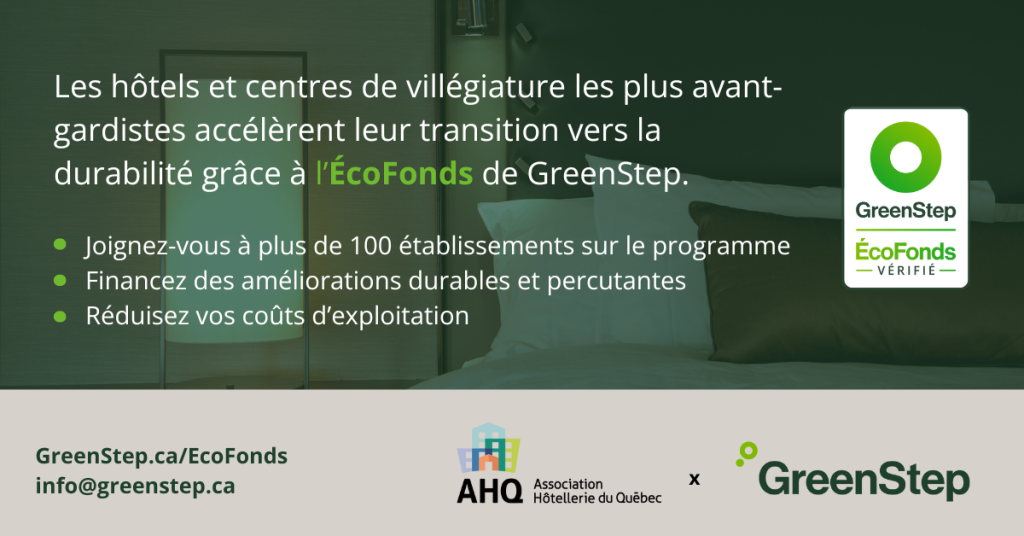 L’Association Hôtellerie du Québec (AHQ) est fière d’annoncer son nouveau partenariat avec GreenStep et son programme ÉcoFonds. Un outil supplémentaire pour appuyer nos membres dans leurs démarches en développement durable.